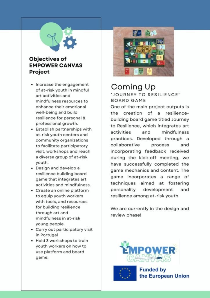 We are thrilled to share the first newsletter for Empower Canvas!  It highlights our mission to foster resilience in at-risk youth through art and mindfulness. We delve into the project’s aims and objectives, focusing on creating innovative tools like a digital platform, board game, and hands-on workshops. Since our kickoff in July 2024, we’ve made significant progress in building a supportive framework.